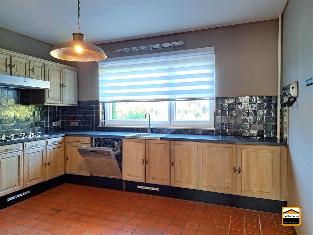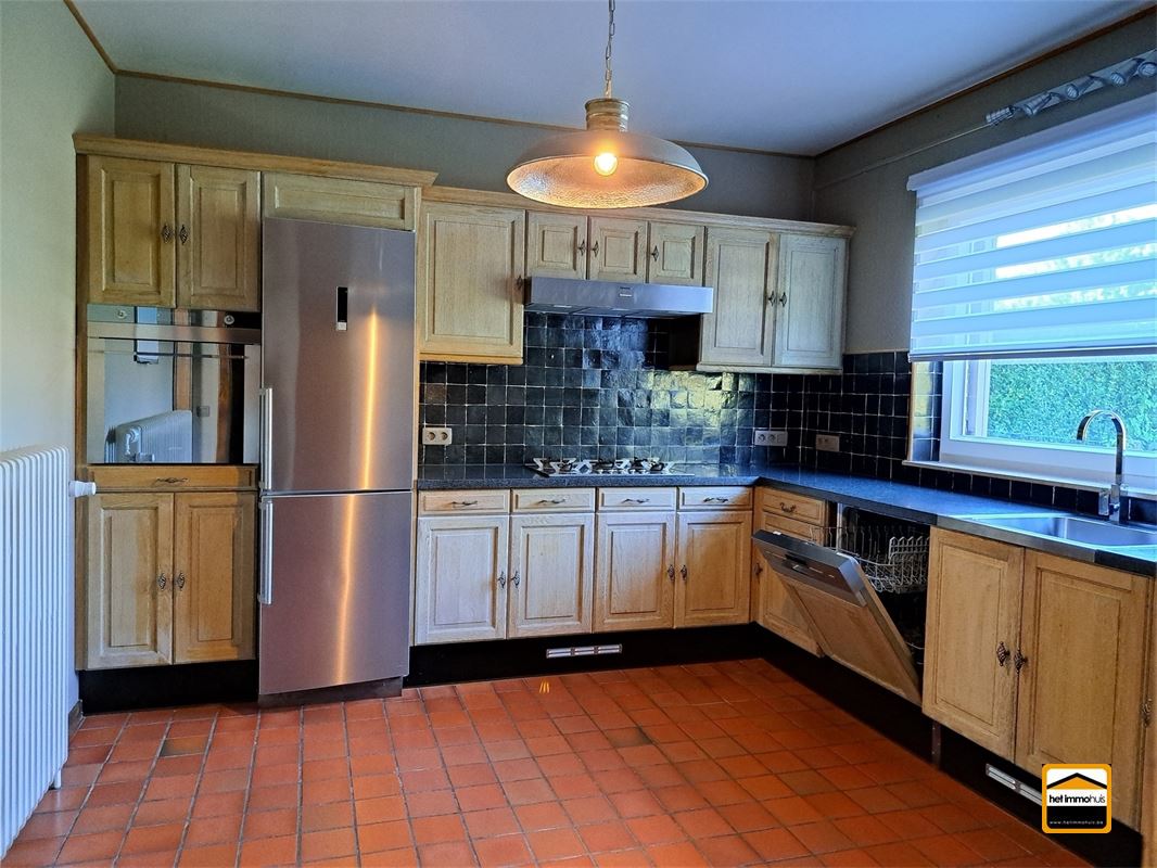 Aansluitend treft men de volledig ingebouwde keuken met volgende toestellen: koelkast met diepvries,