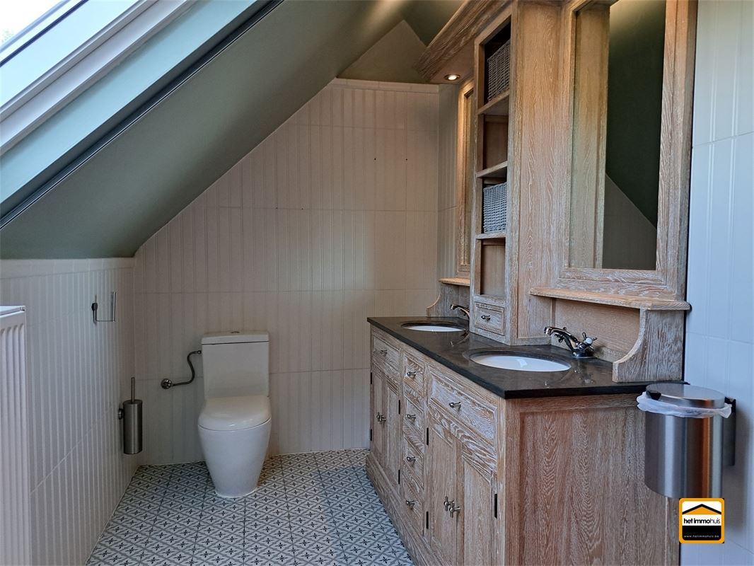 De badkamer is voorzien van een toilet, een dubbele lavabo met meubel en een bad met douchefunctie.