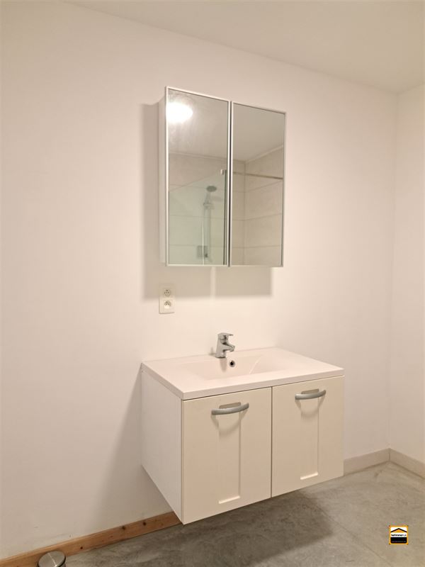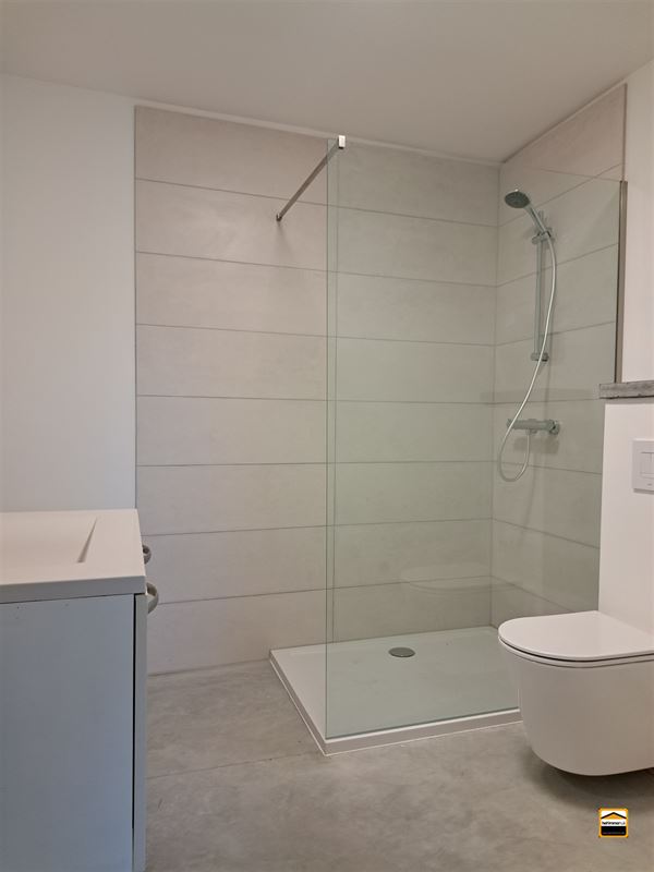 In de badkamer is er een enkele lavabo met meubel, een inloopdouche en een toilet aanwezig.