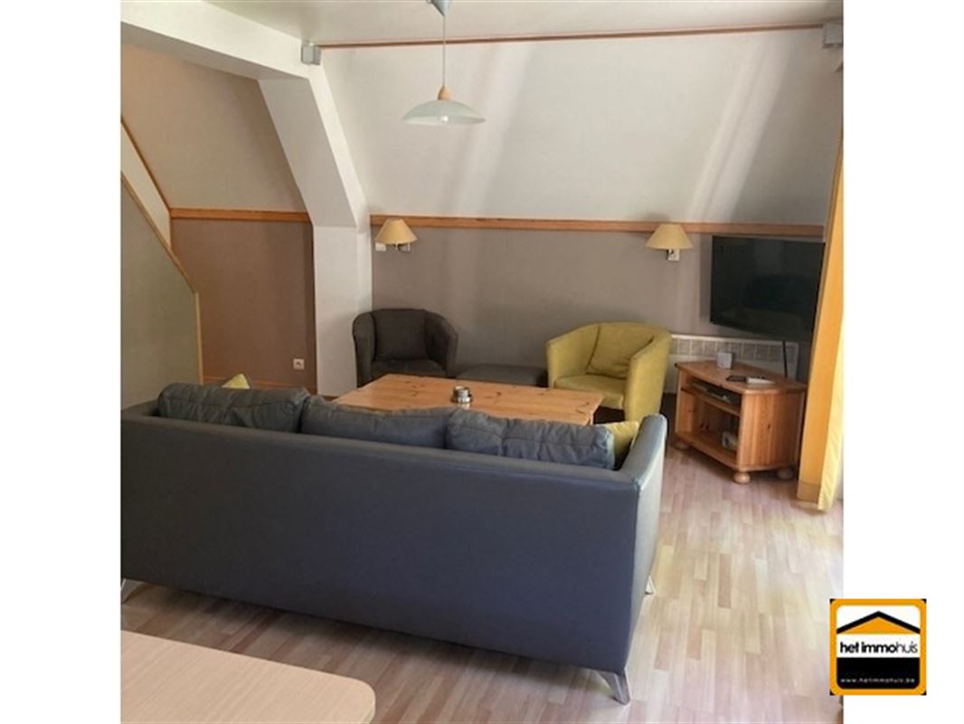 fauteuils en salontafel. Aanwezig zijn een tv en elektrische kachel. Via het schuifraam is er directe