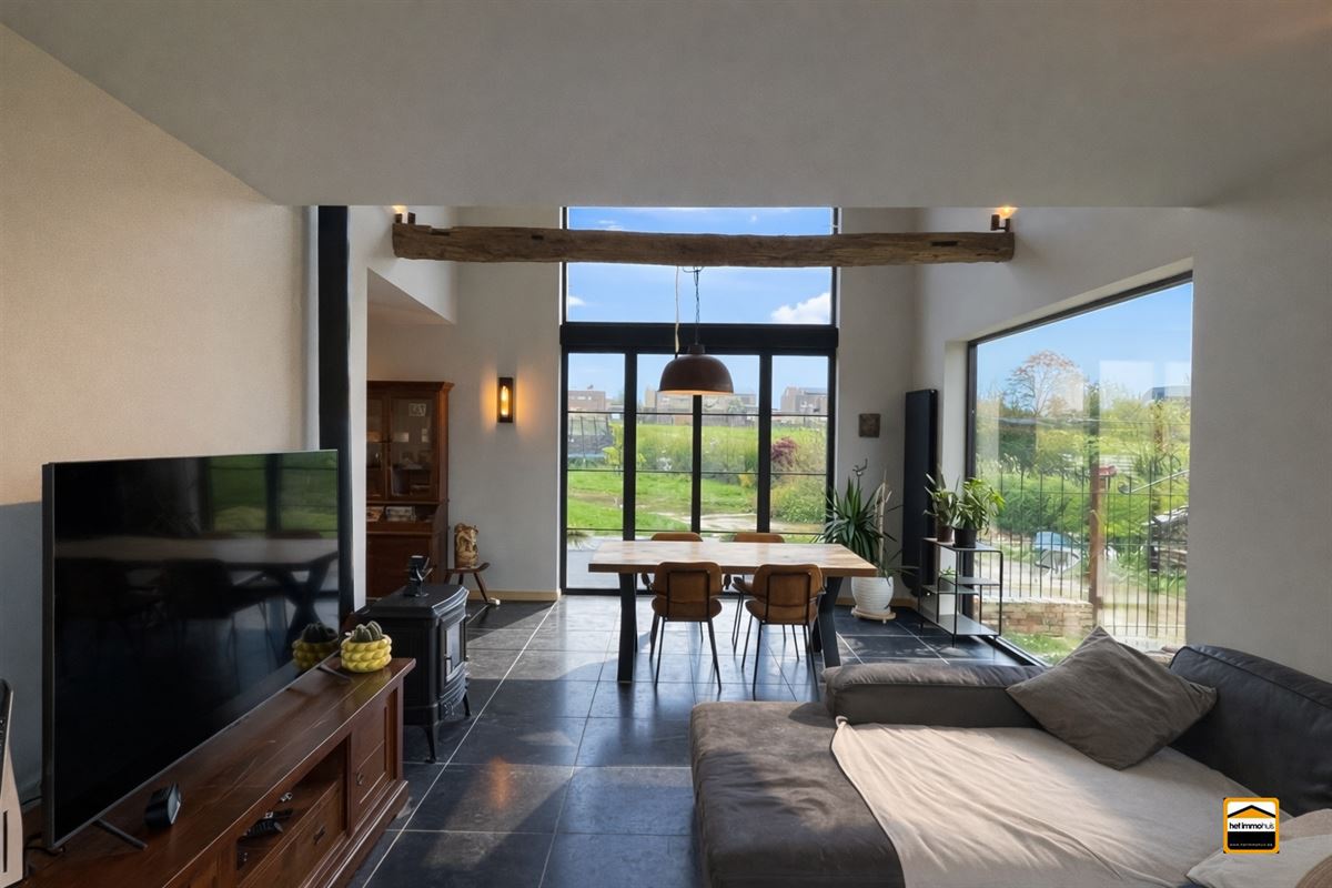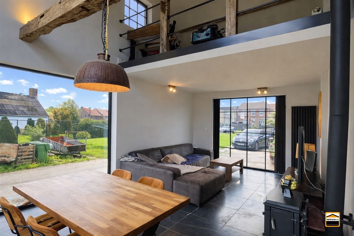 een zithoek en eetkamer met veel lichtinval en opengewerkt tot in de nok. Verder zijn er nog een